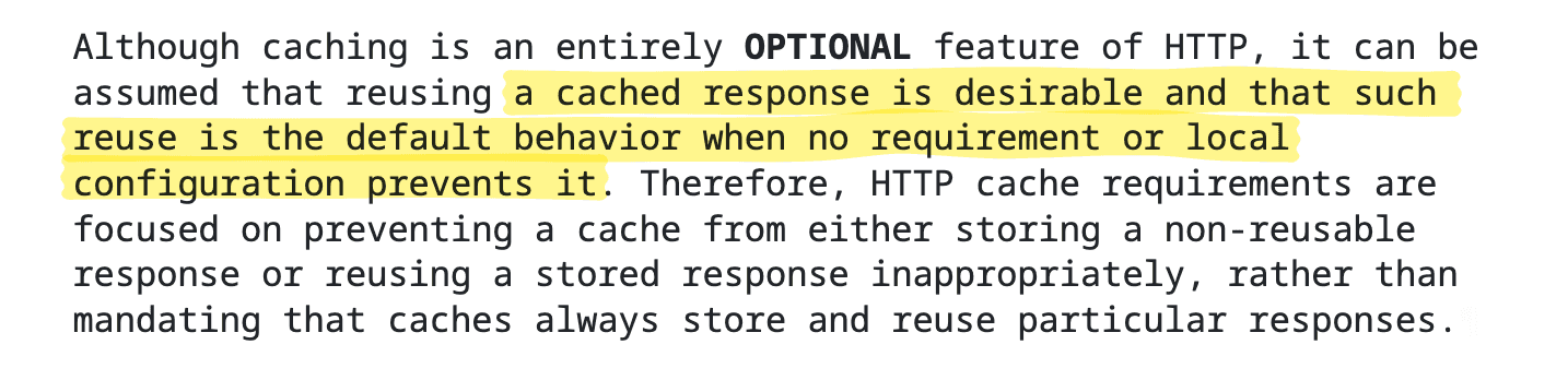 RFC 9111 keeps its requirements light when it comes to how an application should handle caching in its specific context. Instead, it focuses: